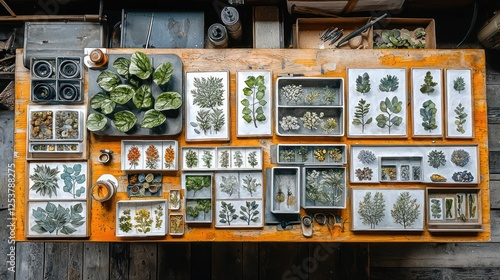 Pressed leaves art studio, overhead view, botanical collection, crafting process
