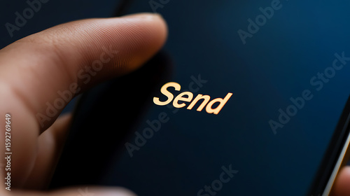 Pressing "Send" on a smartphone. Using technology to connect with others, share information, and complete tasks in a digital world. Focus on digital connectivity.