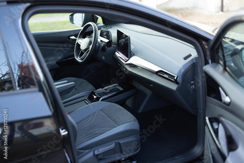 Prestige modern car. Inside car interior with front leather seats, steering wheel, windows, console, gear shift, electric buttons, digital speedometer. Luxury car interior. Car detailing series