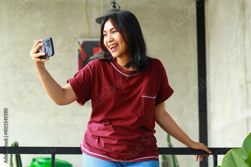 pretty asian woman standing in outside cafe shouting excited playing game online using smartphone