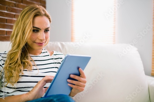 Pretty blonde using tablet on couch