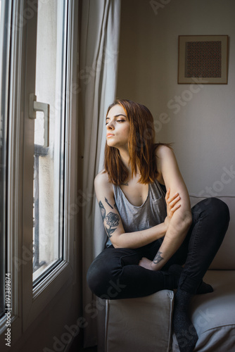 Pretty sensual tattooed woman at window