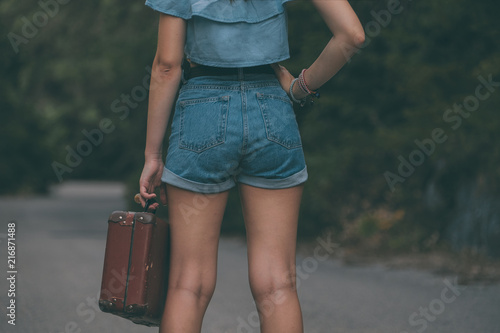 Pretty young woman hitchhiking along a road.