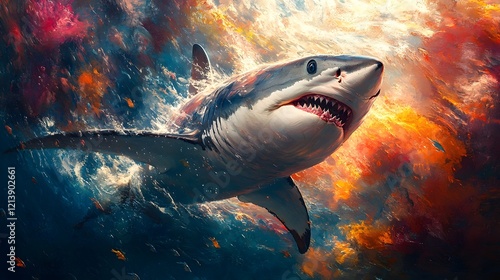 Primal Shark Prowling Through Kaleidoscopic Coral Labyrinth in Vivid Seascape