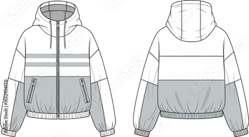 PrintTrendy colorblock cropped hoodie jacket flat sketch, front and back view, fashion technical drawing, urban streetwear outerwear design