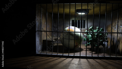 Prison or jail cell wall with window with bars, exterior perspective, COVID-19 corona virus disease pandemic outbreak, Coronavirus spreading among inmates, SARS-CoV-2 in correctional facility complex