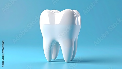 Pristine, glossy white molar sits against a soft, light blue background, softly reflecting light