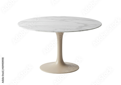 Pristine round white marble table with grey veining, light brown cylindrical base, clean minimalist studio with transparent copy space. Concept of strategic planning