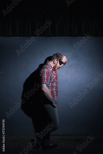 Problems in life. Tired male in prison. Ashamed unrecognizable man on blue background, night urban light, guilty in crime, shame concept
