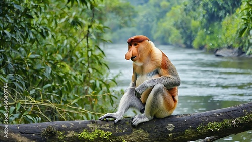 Proboscis monkey sitting near river in mangrove forest