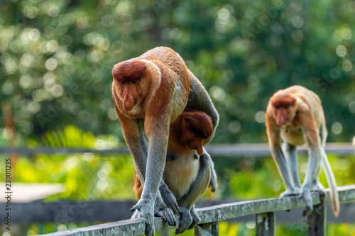 Proboscis Monkeys on a wooden barrier in a Mangrove forest in Borneo