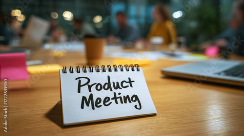 Product meeting note on wooden table with colleagues discussing strategy teamwork and planning in modern office collaborative workspace