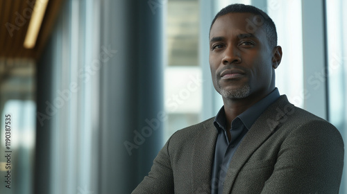 Professional African American man in business attire against modern interior. Great for corporate leadership, executive presence or workplace diversity themes.