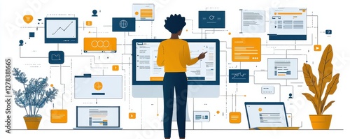 Professional analyzing data on digital dashboards surrounded by technology and plants
