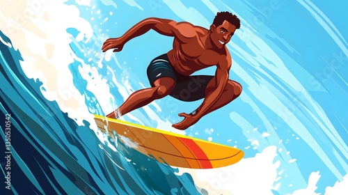 Professional Black Male Surfer on Surfboard Cartoon Illustration for Sports Brand Marketing