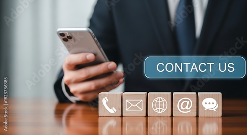 Professional businessman holding smartphone, with "Contact Us" button and diverse communication channel icons for customer support.