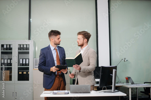 Professional businessmen collaborating in modern office, using laptop and tablet, discussing strategy, teamwork, and innovation.