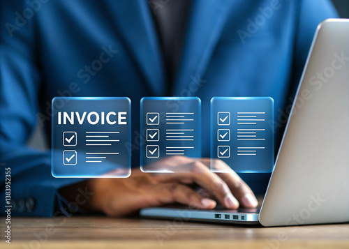 Professional businessperson typing on laptop with digital invoice overlay. Close-up of hands working on laptop with transparent invoice icons. Modern office workspace featuring digital invoices and te