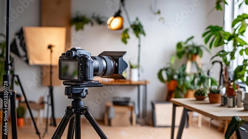 Professional camera setup in a bright creative studio with plants