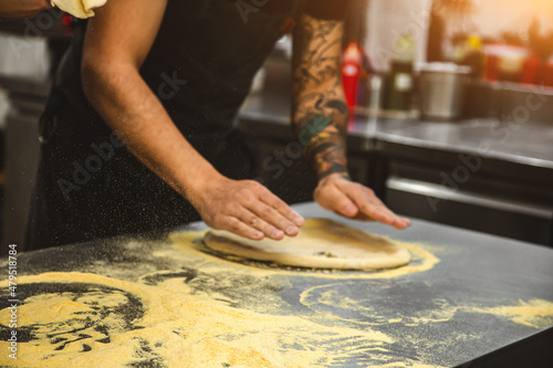 Professional chef cooking in the kitchen restaurant at the hotel, preparing dinner. A cook in an apron makes a pizza.