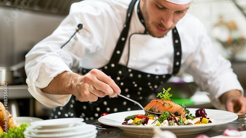 Professional chef meticulously plating a gourmet dish in a restaurant kitchen, showcasing culinary artistry and attention to detail.