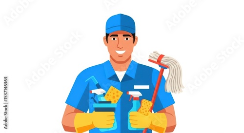 Professional Cleaning Service Worker Holding Various Tools and Supplies for Effective Household Cleaning Solutions