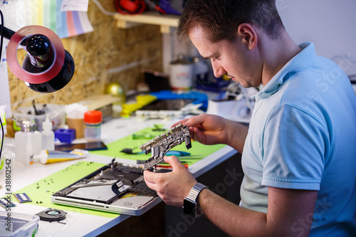 Professional computer and tablet repair shop or service. Close up of a computer board. Electronics concept. Detail from a laptop under repair