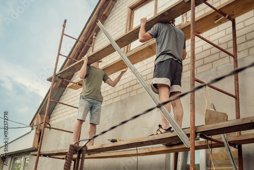 Professional Construction Workers or Builders Working on Scaffolding for House Exterior Renovation