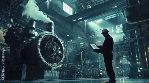 Professional Engineering workers in modern factories use laptop controlling programs for automatic machinery at industrial plants with a steam engine automatically