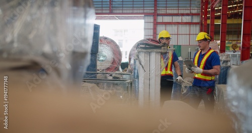 Professional engineers are inspecting wrapped heavy machinery using a digital tablet in a large industrial factory, focusing on supply chain management and quality control efficiency.