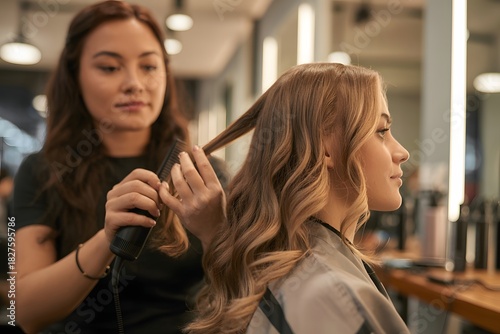 Professional hairstylist creates beautiful wavy blonde hair for a client in a modern salon, hair styling, beauty treatment, elegance, pampering, fashionable look, hair care services