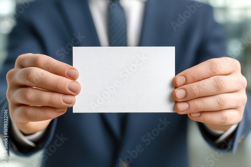Professional Man Holding Blank White Business Card in Elegant Office Setting