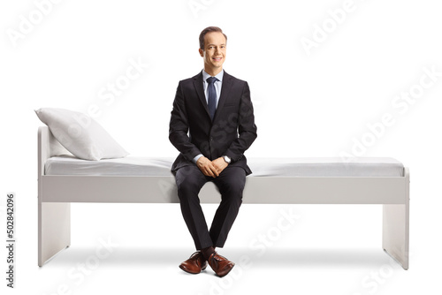 Professional man in a suit and tie sitting on a bed