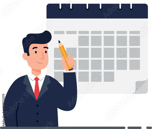 Professional man in a suit holding a pencil beside a calendar in a flat vector illustration