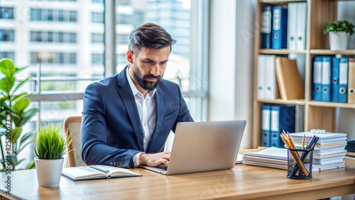 Professional Manager at Desk: A business manager working at a desk, surrounded by documents and a laptop, illustrating productivity and organization.