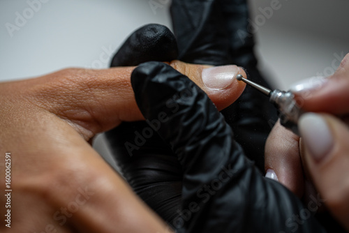 Professional manicurist cleaning cuticles with a rounded electric tool during nail care session