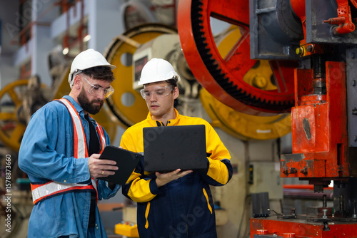 Professional Mechanical Engineer team Working on Personal Computer at Metal lathe industrial manufacturing factory. Engineer Operating lathe Machinery. Product quality Inspection