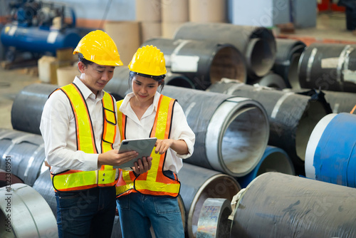 Professional Mechanical Engineer team Working on Personal Computer at metal sheet profiling industrial manufacturing factory. Product quality Inspection