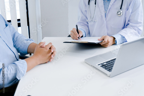 Professional medical doctor in white uniform gown coat interview consulting patient.