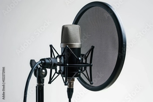 Professional microphone with a pop filter on a white background