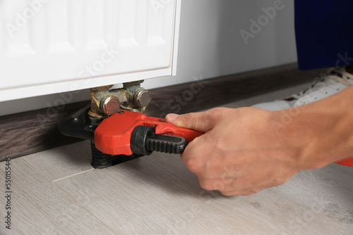 Professional plumber using adjustable wrench for installing new heating radiator indoors, closeup