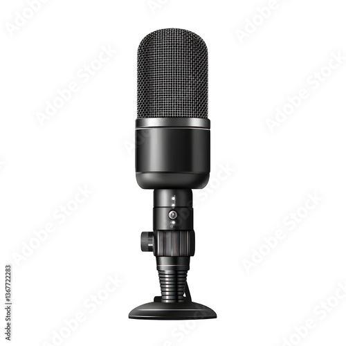 Professional podcast microphone capturing modern aesthetics and detailed branding, isolated transparent PNG, clearly visible English labels.