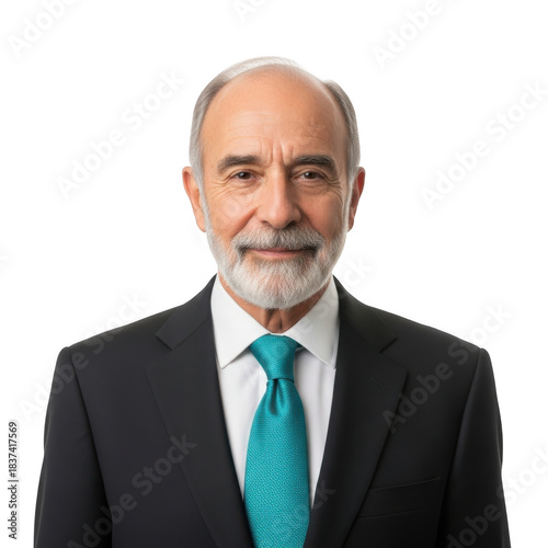 Professional portrait of a distinguished elderly gentleman with a white beard wearing a dark suit and teal tie isolated on transparent background