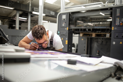 Professional print worker checking imprint quality and color matching with magnifying glass in printing house.
