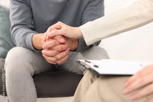 Professional psychologist supporting patient during therapy in office, closeup