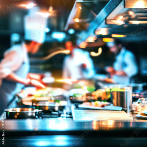 Professional restaurant kitchen with chefs cooking delicious food, generative ai