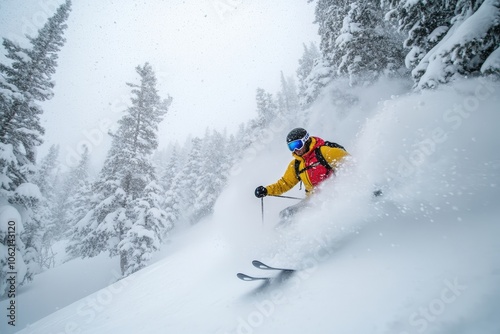Professional skier enjoying a deep powder day at a ski resort, making turns in fresh snow among the trees