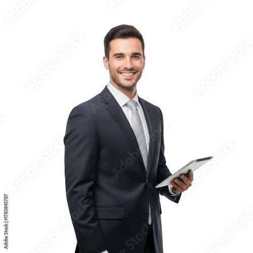 Professional smiling businessman holding a tablet device with a clipboard in his hand isolated on transparent background