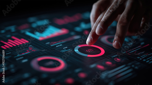 Professional using hands to explore digital marketing analytics on technology dashboard