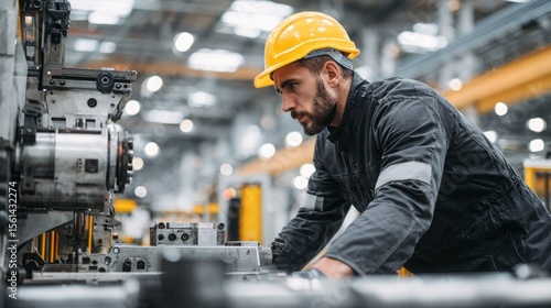 Professional worker in a hard hat working with a modern machine on a factory production line.